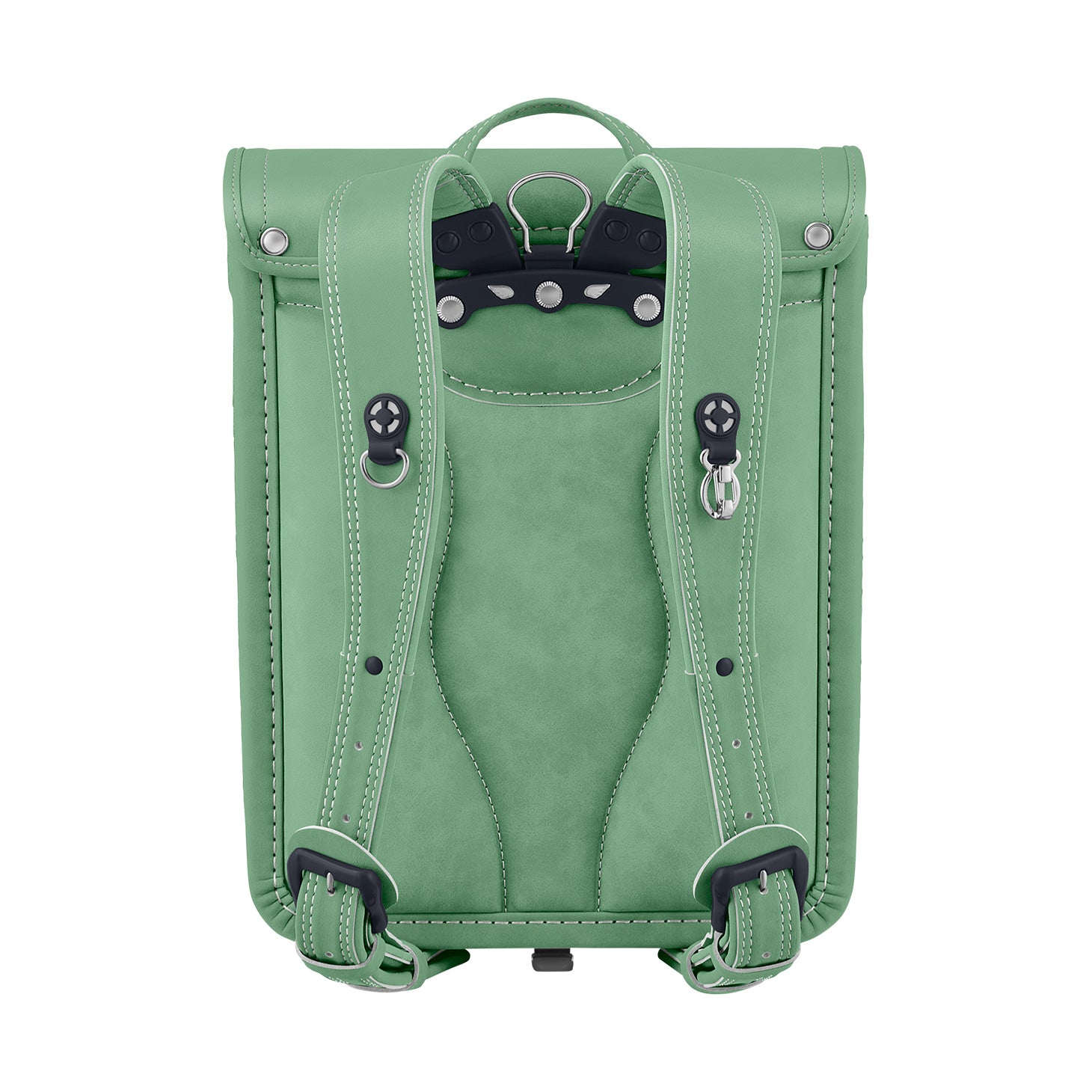 背あてと肩ベルト、下ベルト裏に、吸湿と放湿を繰り返す合成皮革「ブレスレザーⓇ」を採用。従来品に比べ通気性が高く、背中のムレを軽減します。