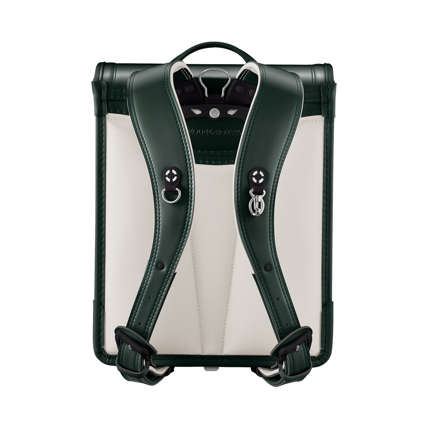 どのカラーを選んでも、落ち着いたイメージを保つシンプルなデザインが特長です。サイドには立体的な「イチョウ盛り」など、本革ランドセルなどに使われる伝統的な加工もプラスし、深みのあるデザインに仕上げています。