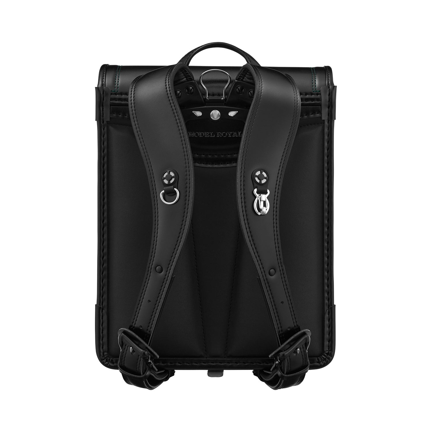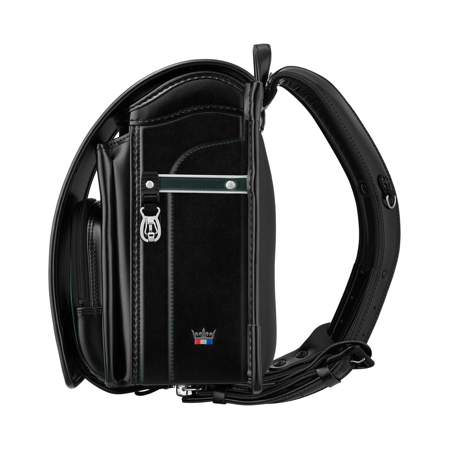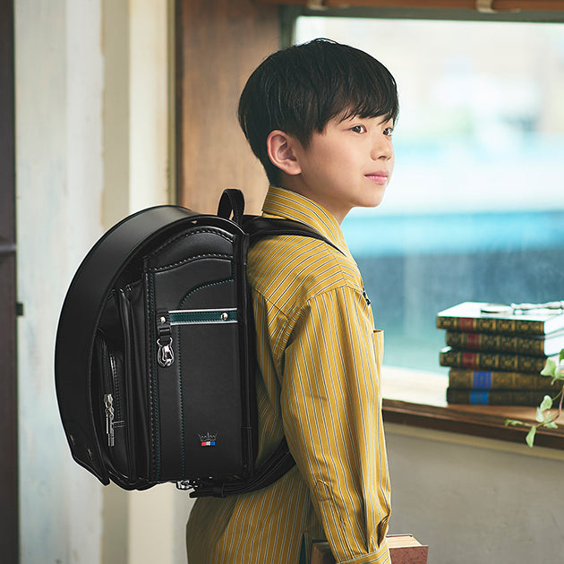 サイドの前ヒモやステッチをアクセントカラーでまとめることで、ランドセル全体を引き締めるデザイン。サイドに入ったトリコロールと王冠の刺しゅうがワンポイントになり、フォーマルなデザインの中にも遊び心を感じさせます。