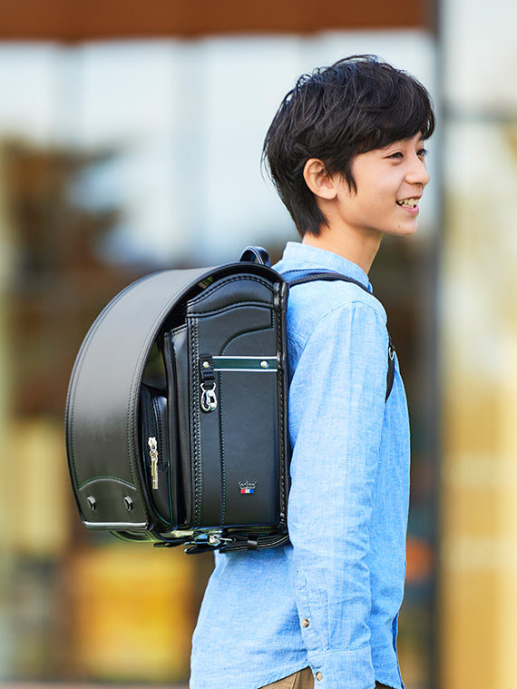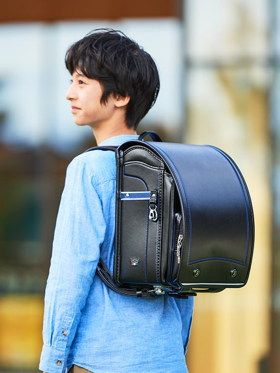 サイドの前ヒモやステッチをアクセントカラーでまとめることで、ランドセル全体を引き締めるデザイン。サイドに入ったトリコロールと王冠の刺しゅうがワンポイントになり、フォーマルなデザインの中にも遊び心を感じさせます。