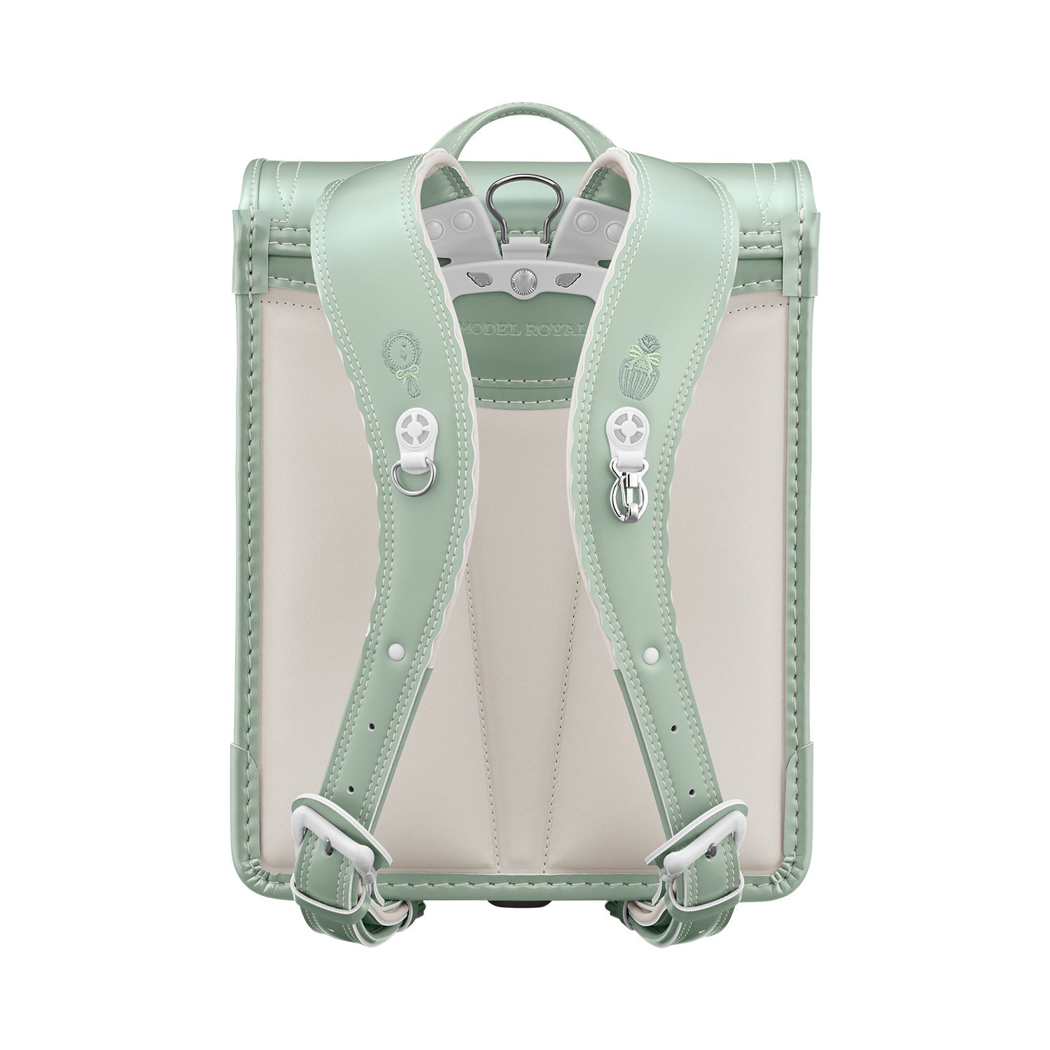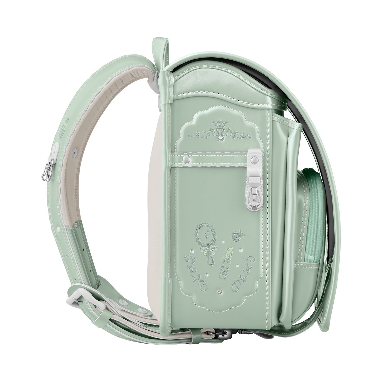 ツタ模様やコスメモチーフの刺しゅう、ジュエリーのように輝く飾り鋲(びょう)などがランドセル全体に散りばめられエレガントさを表現。優しい色味で上品に輝くパール生地との相性もぴったりです。