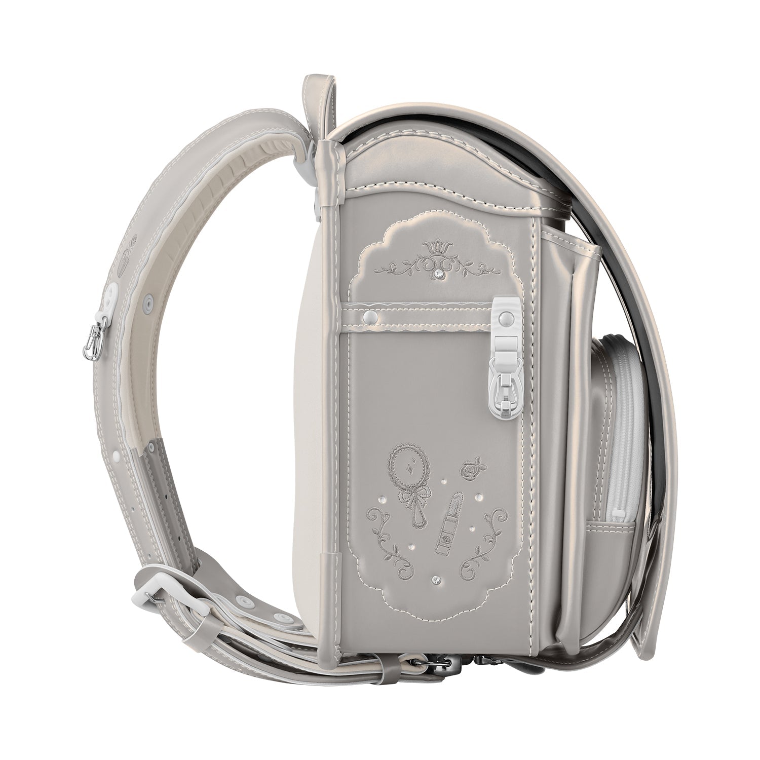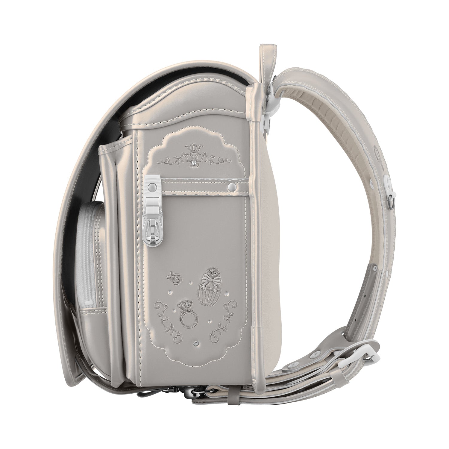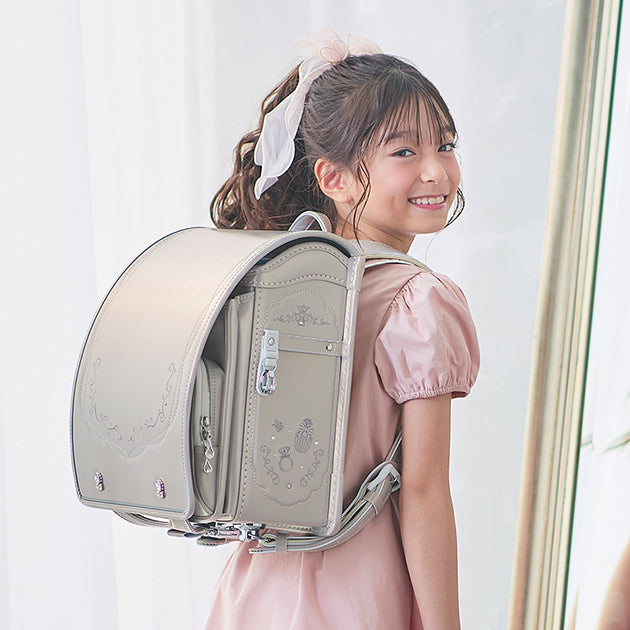 ツタ模様やコスメモチーフの刺しゅう、ジュエリーのように輝く飾り鋲(びょう)などがランドセル全体に散りばめられエレガントさを表現。優しい色味で上品に輝くパール生地との相性もぴったりです。