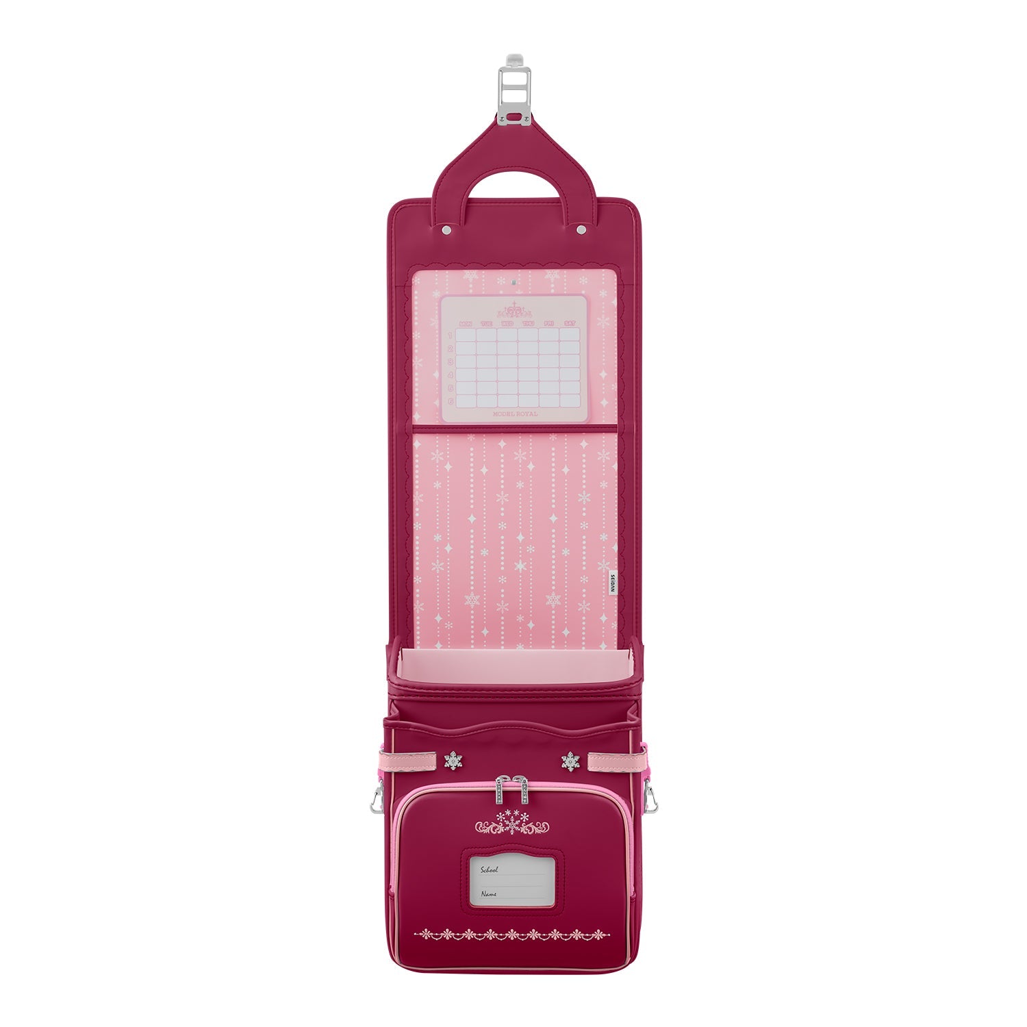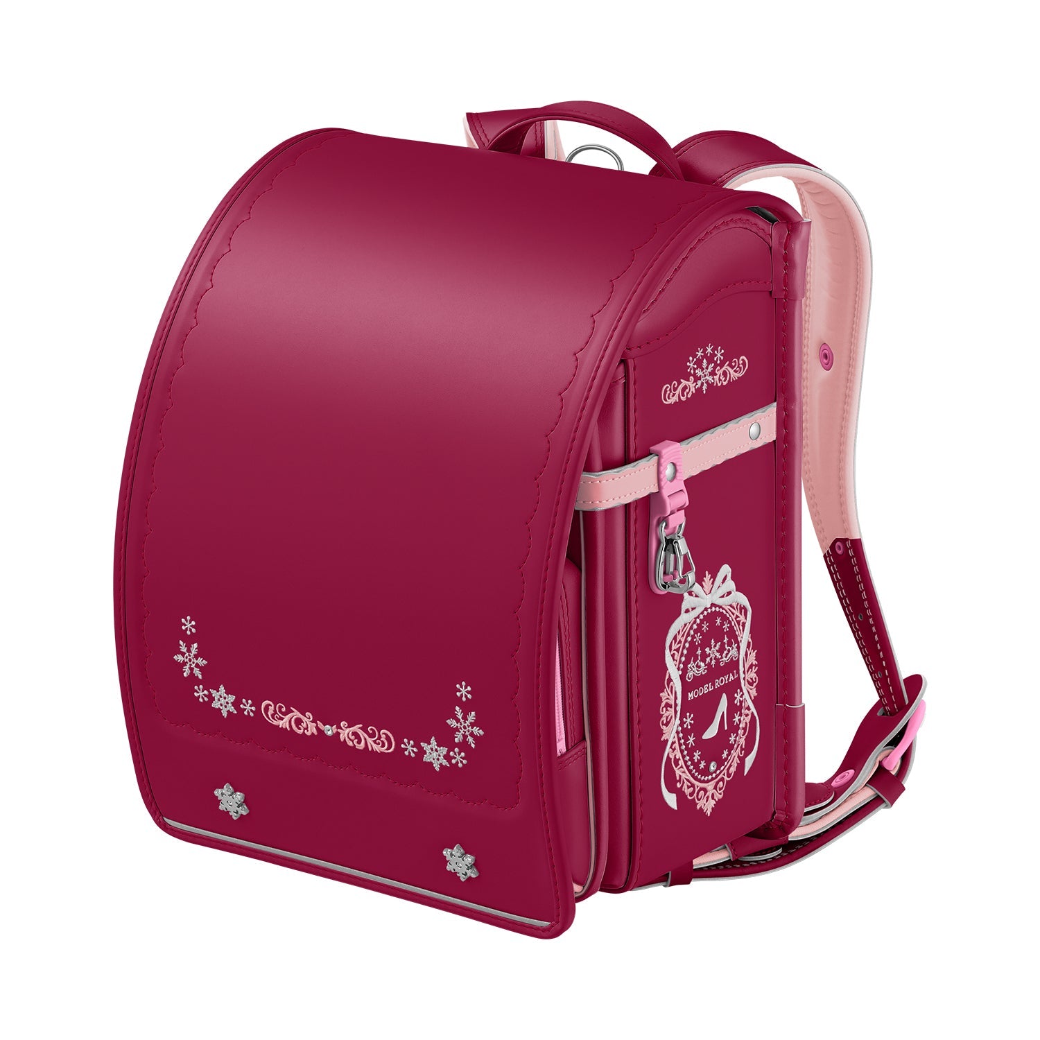 前ポケットには、雪の結晶をモチーフにした刺しゅう。 -