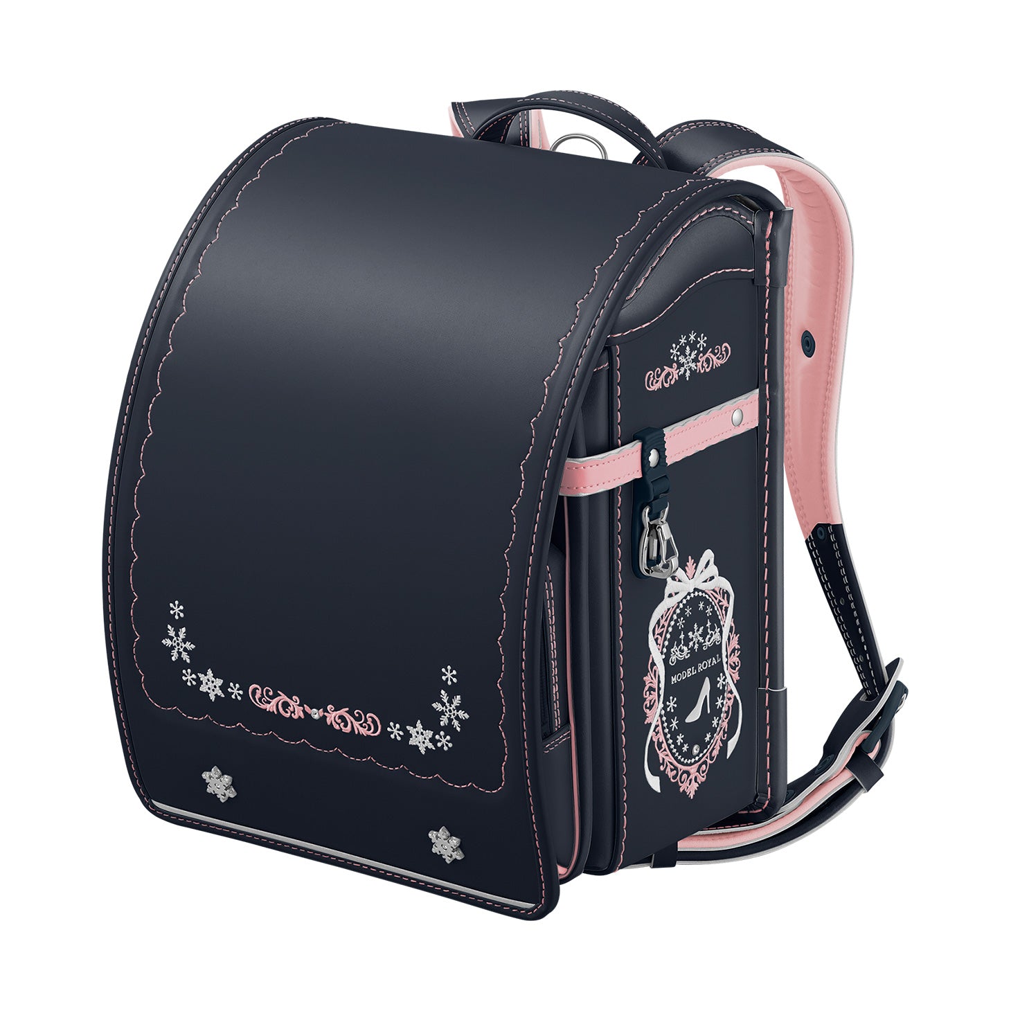 全体的にちりばめられた刺しゅうや、クリスタル・ガラスを使った飾り鋲(びょう)など、あちこちに雪の結晶モチーフを採用。やわらかなペールトーンのカラーとともに、透明感のある美しい世界感を演出します。女の子をかわいらしく魅せるスウィートさと気品をあわせもつ、ロマンティックなデザインです。