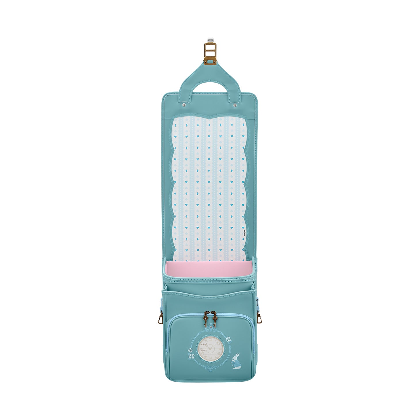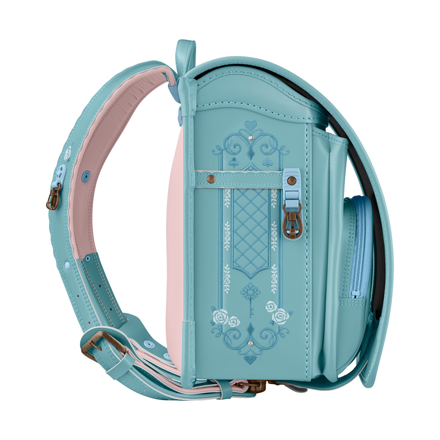 カブセにはバラをモチーフにした刺しゅうや飾り鋲(びょう)、サイドには不思議な扉と鍵をモチーフにした豪華な刺しゅうをあしらうなど、細部にまでアリスの世界観が表現されています。ニュアンスカラーをベースに、金属パーツをアンティークゴールドで統一して、クラシカルな雰囲気を漂わせるデザインも特長です。