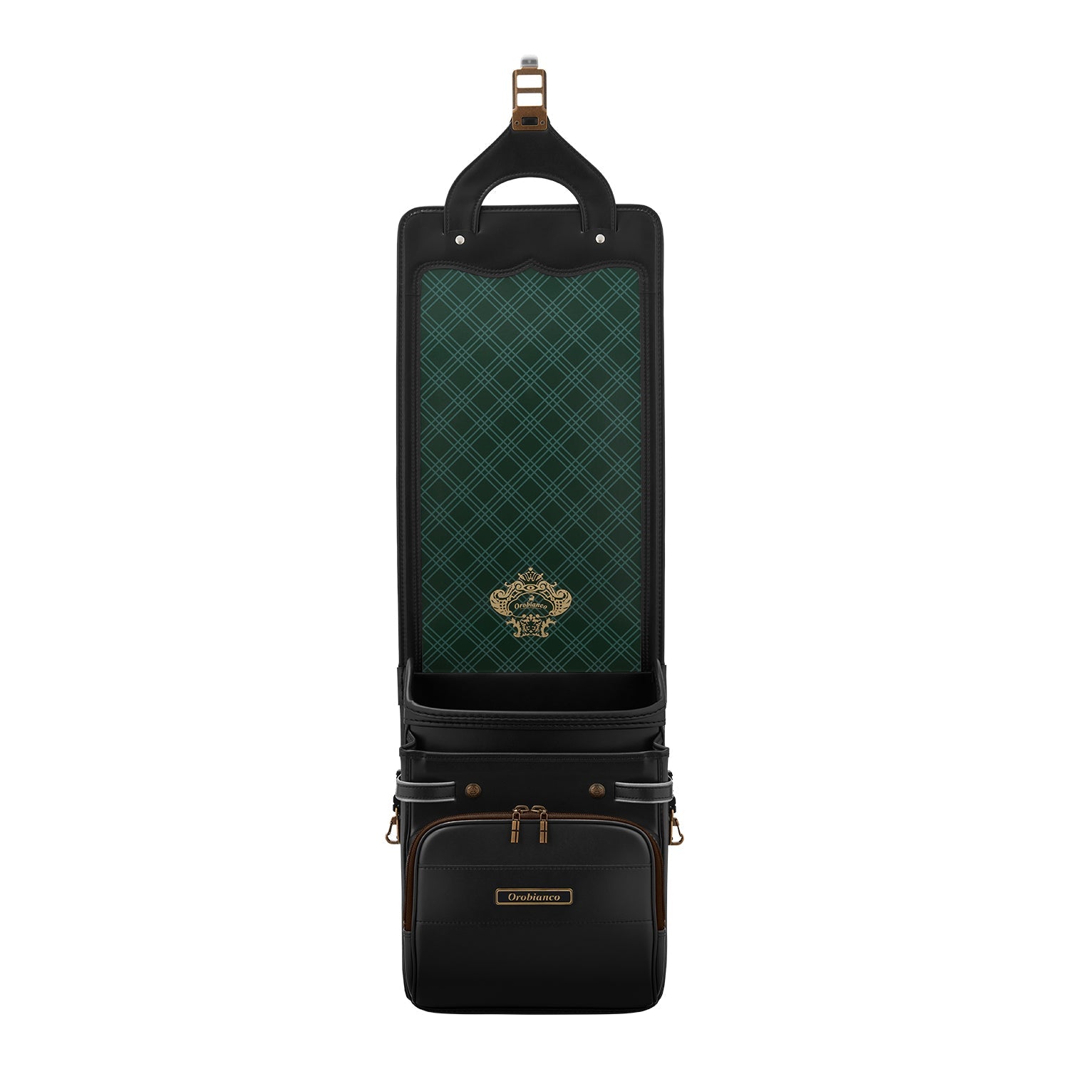 金属パーツは、フォレストグリーンなどのシックなカラーと相性の良いアンティークゴールドで統一。カブセに入った飾り鋲(びょう)には、オロビアンコのロゴが刻まれています。サイドには職人技をイメージする網掛けの刺しゅうと流れるような盛り加工をほどこし、高級感あふれる仕上がりに。