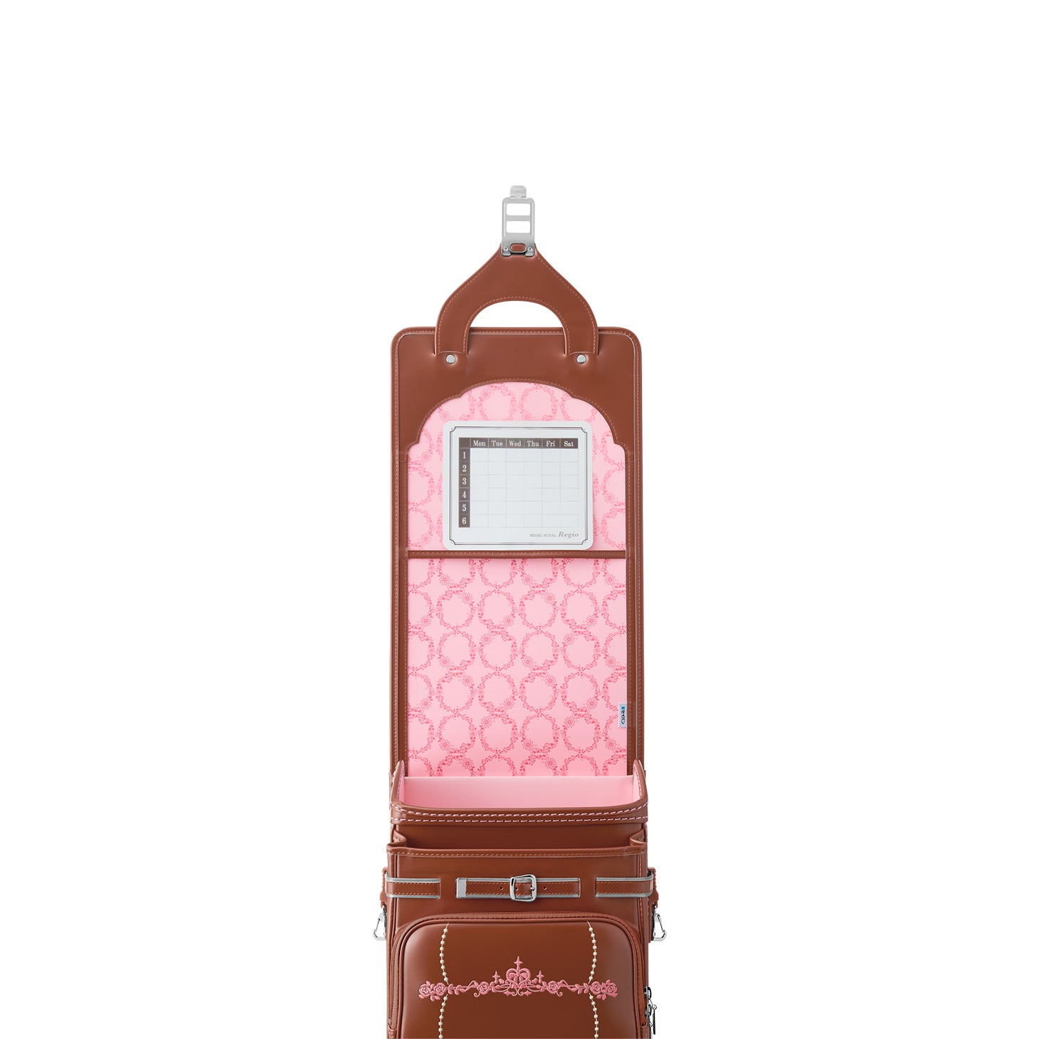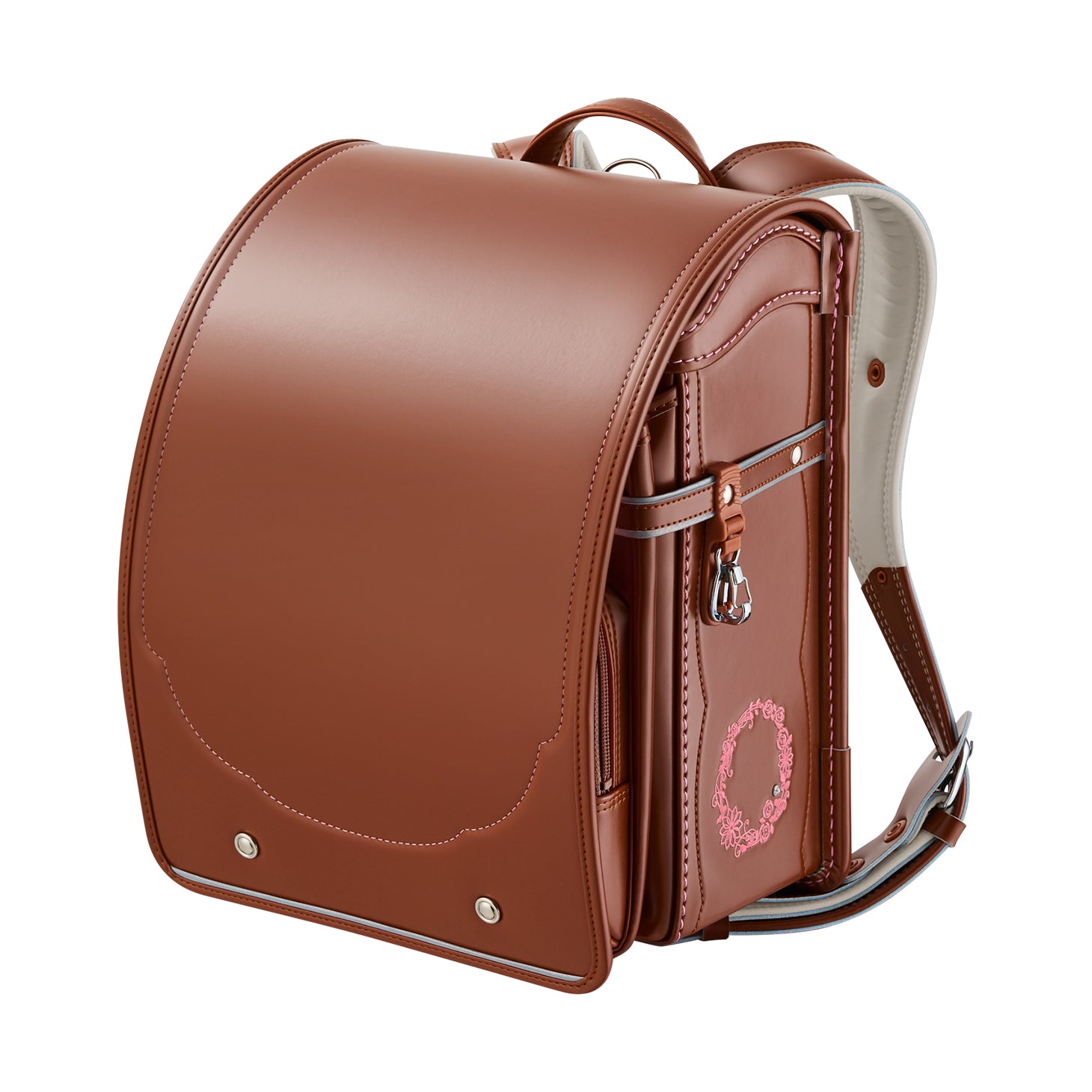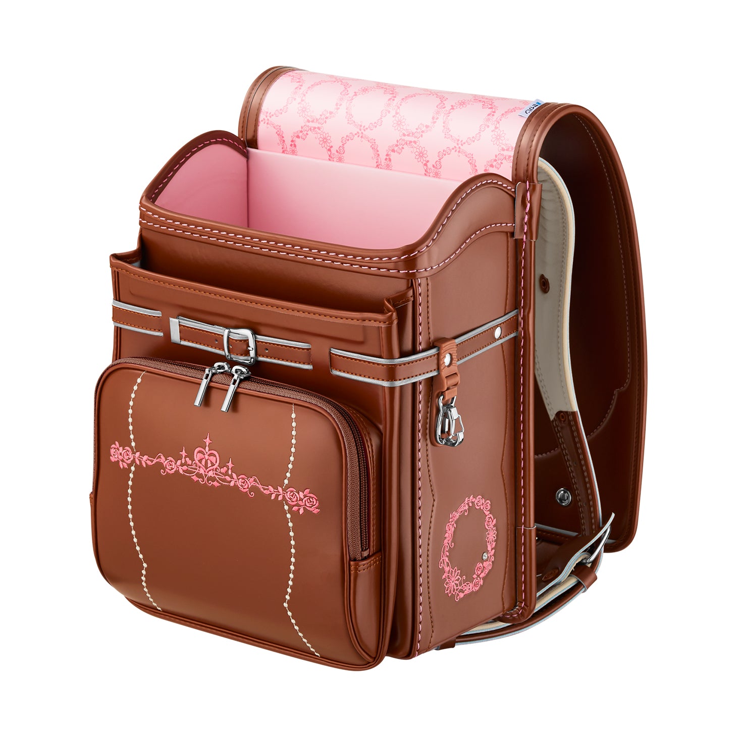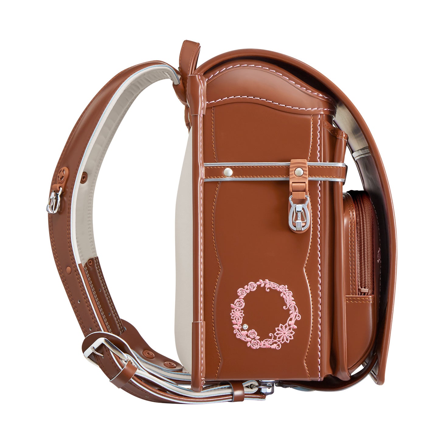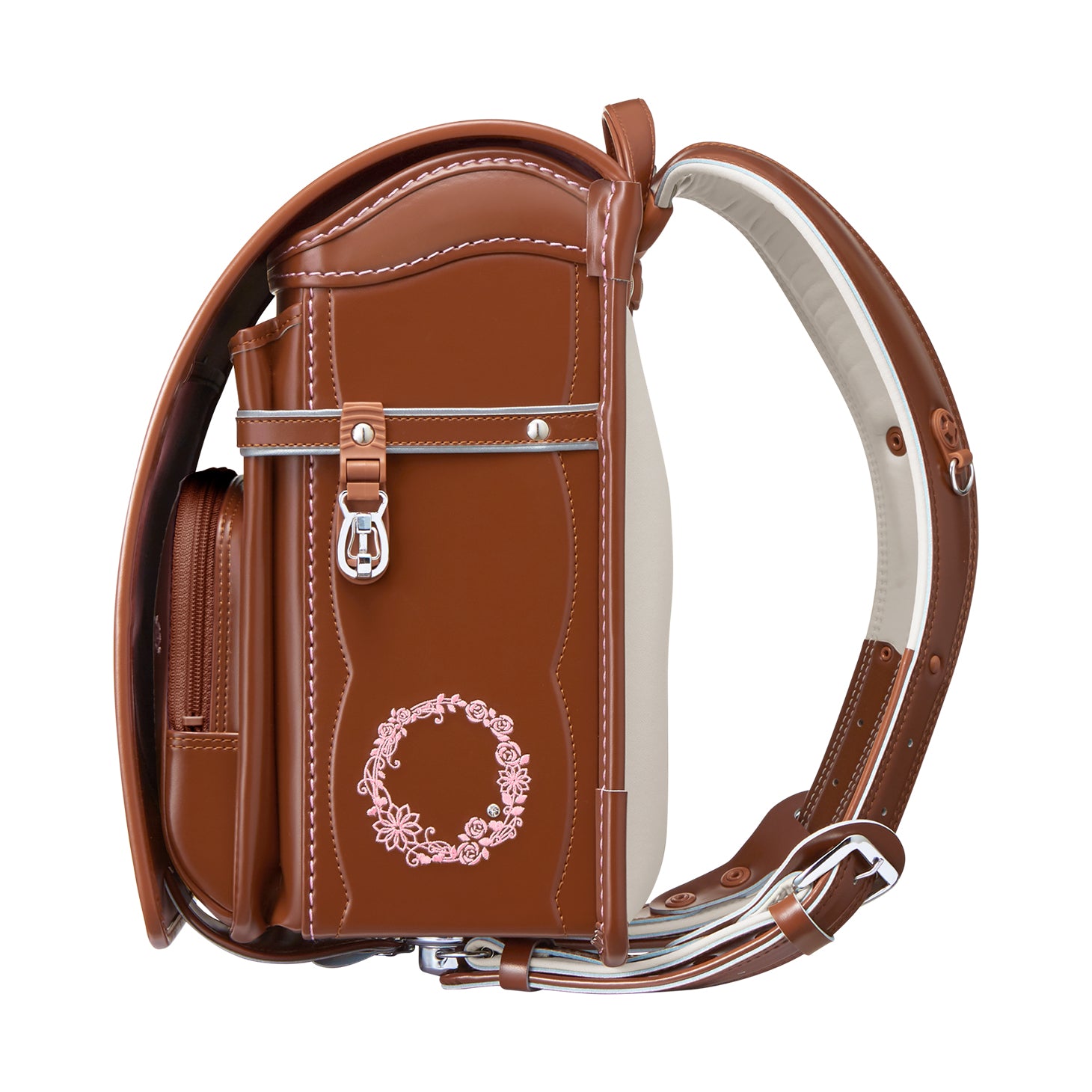 前ポケットには、上質な雰囲気を醸し出す、花かんむりとドットのステッチ。 -