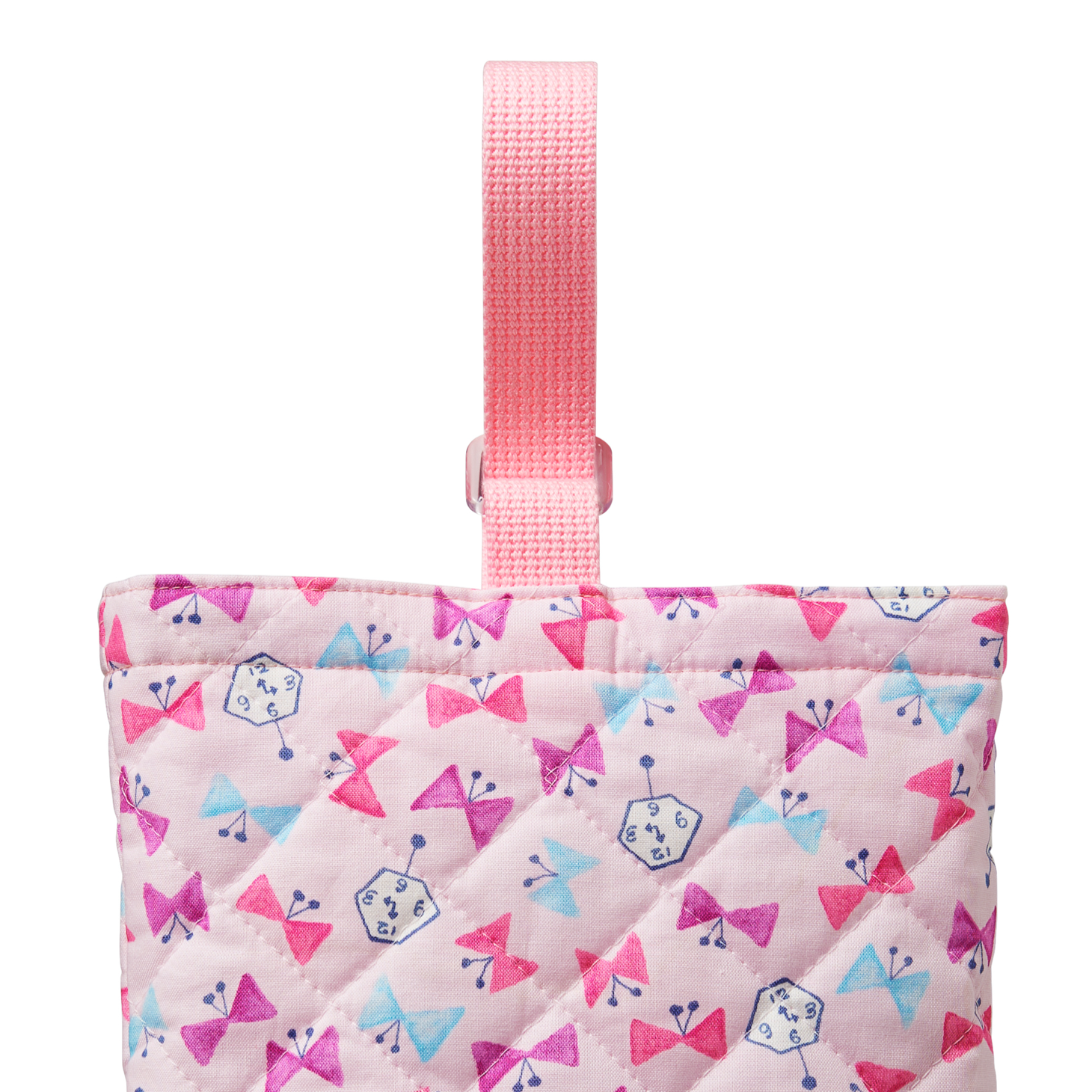 キルティング加工生地のシューズケース。持ち手をDカンに通すだけで簡単に口が閉じられます。