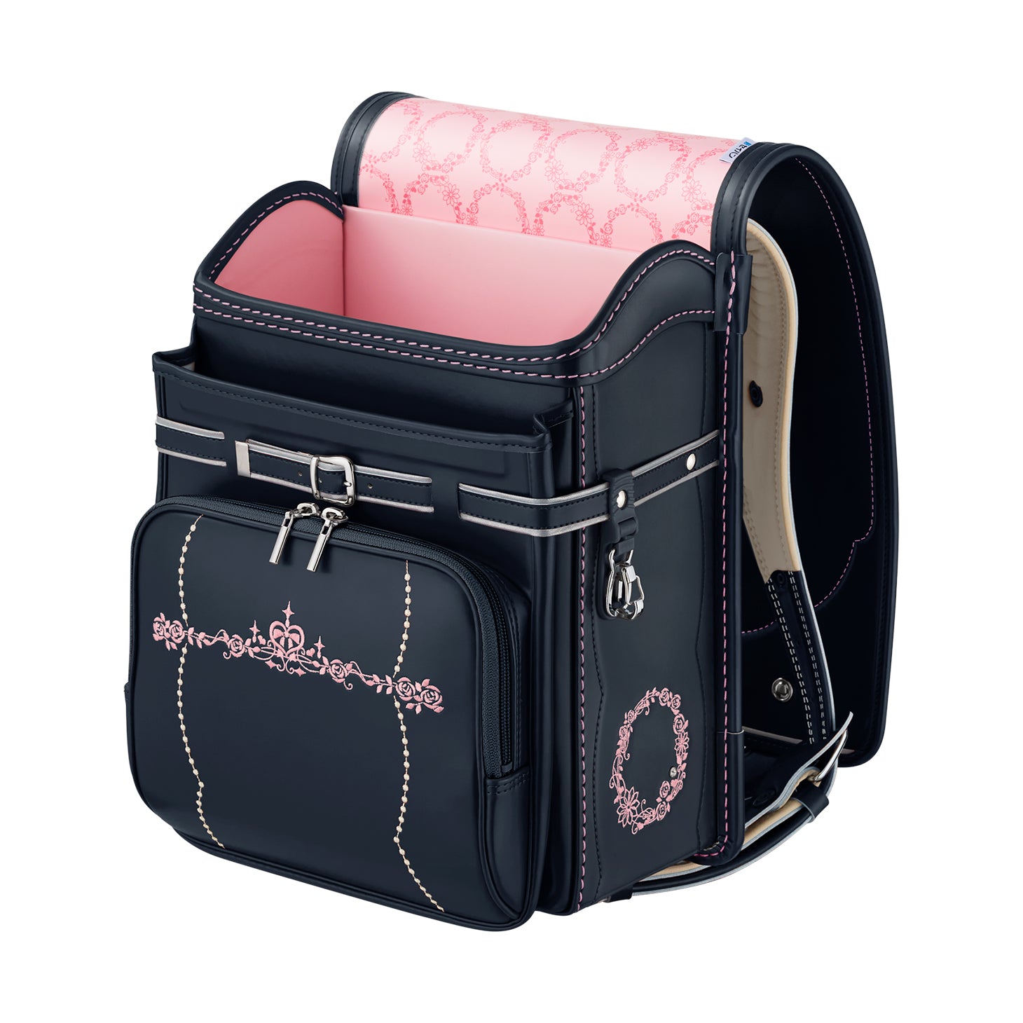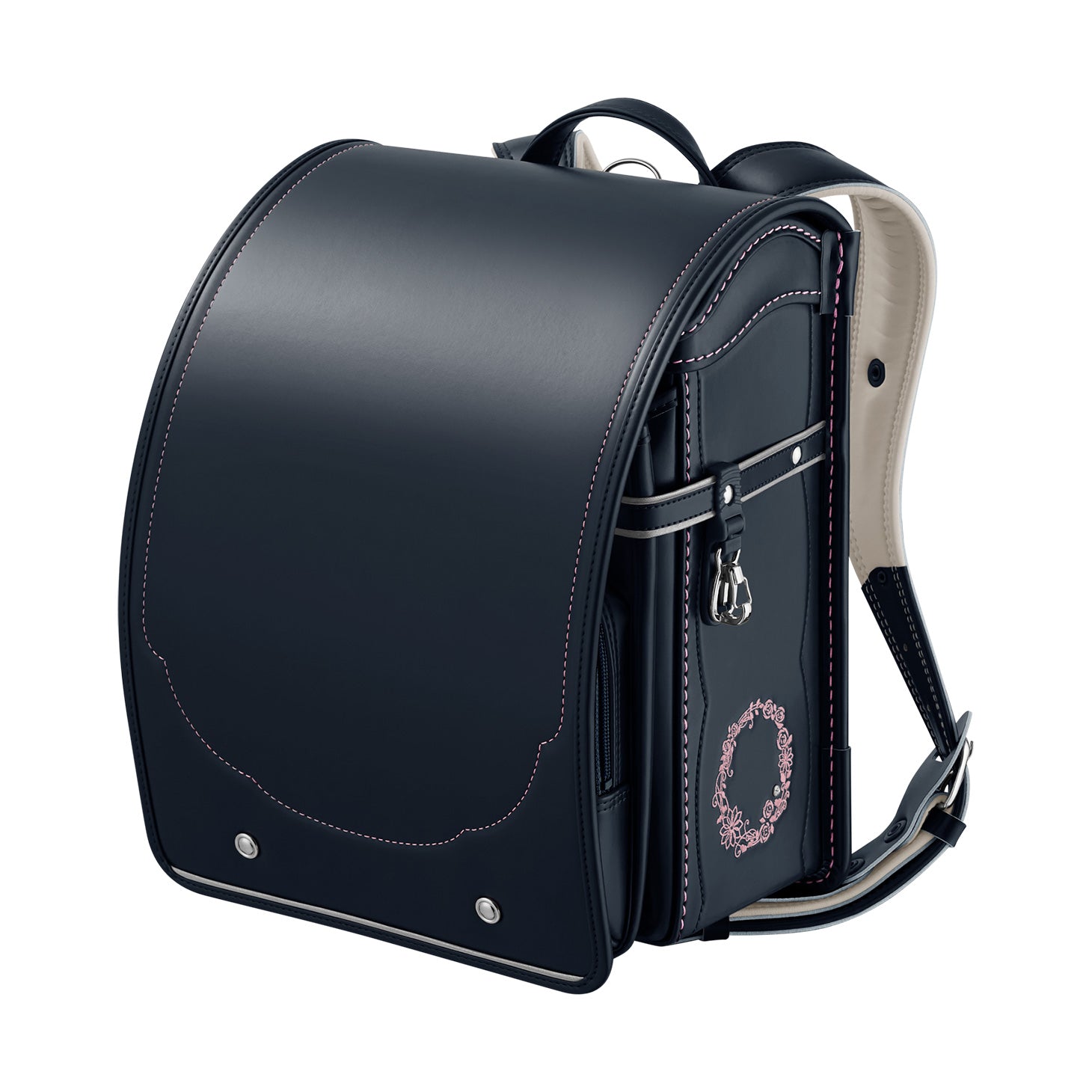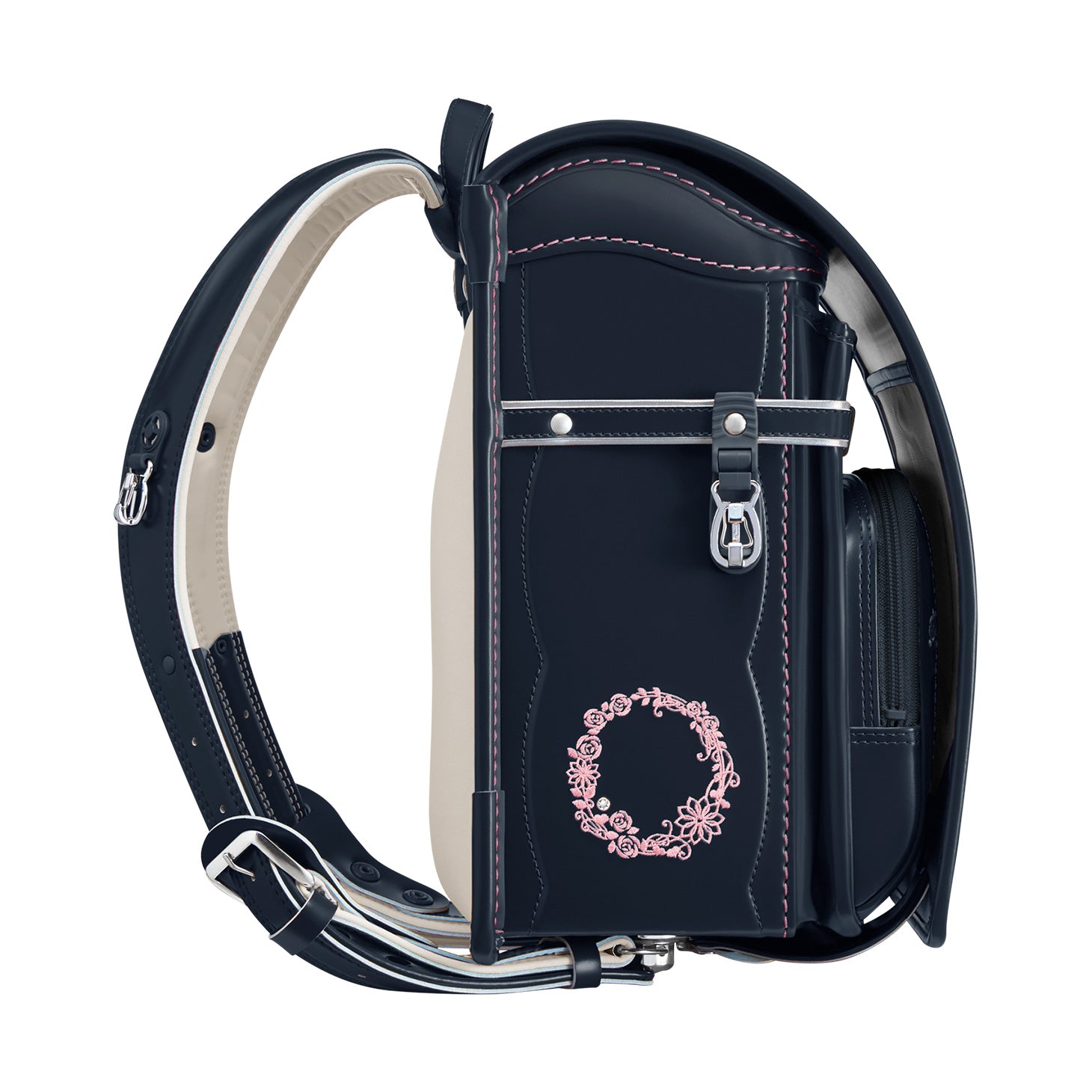 女の子が憧れる「花かんむり」をデザインコンセプトに、高級感を感じさせるデザインに仕上げた「モデルロイヤル・レジオ ベーシック」。金具類や飾り鋲(びょう)は、ニッケルを使いシックな雰囲気を演出。「せみね」と「ブレスレザー®」で快適さを充実させた、高学年になっても使いやすい安心のクオリティです。