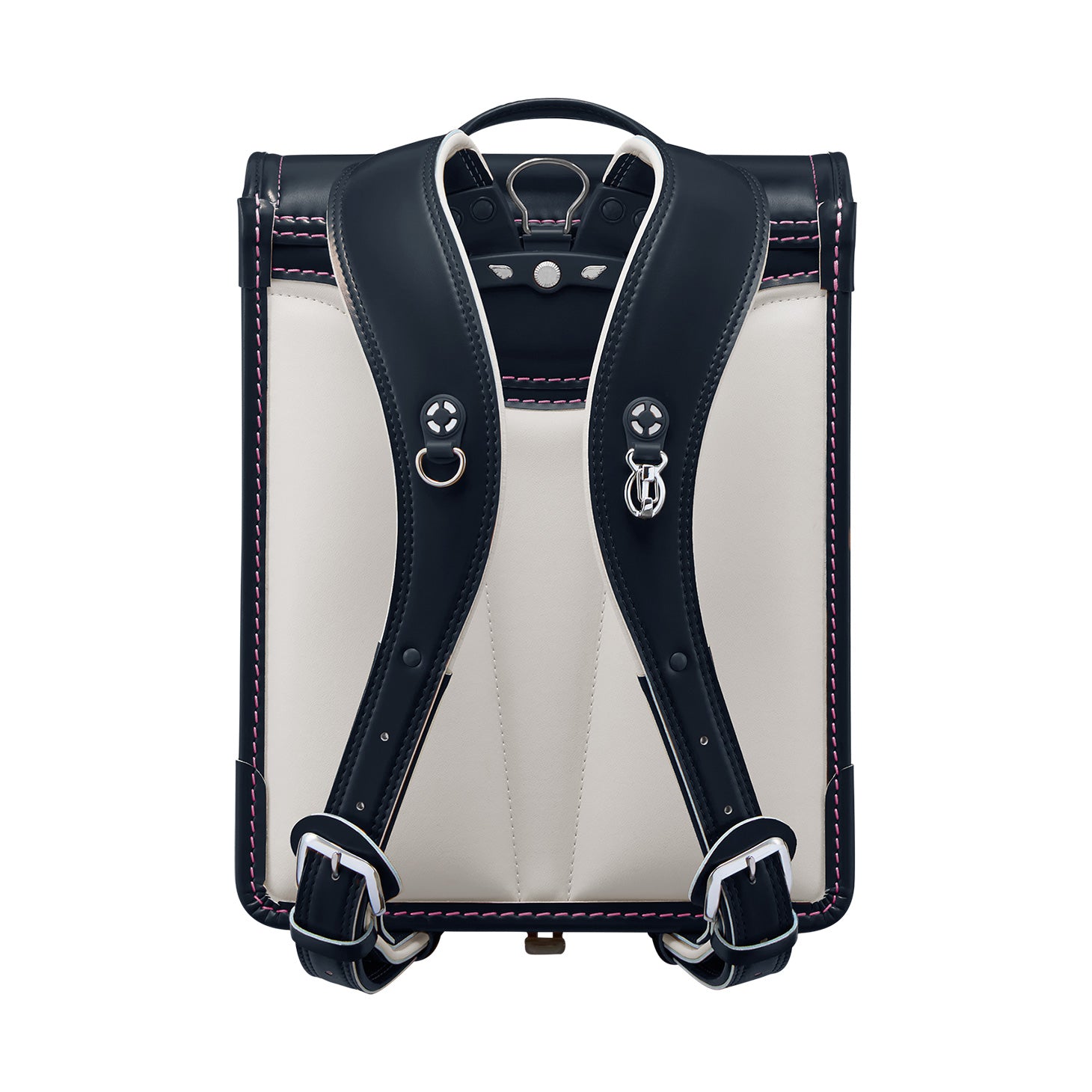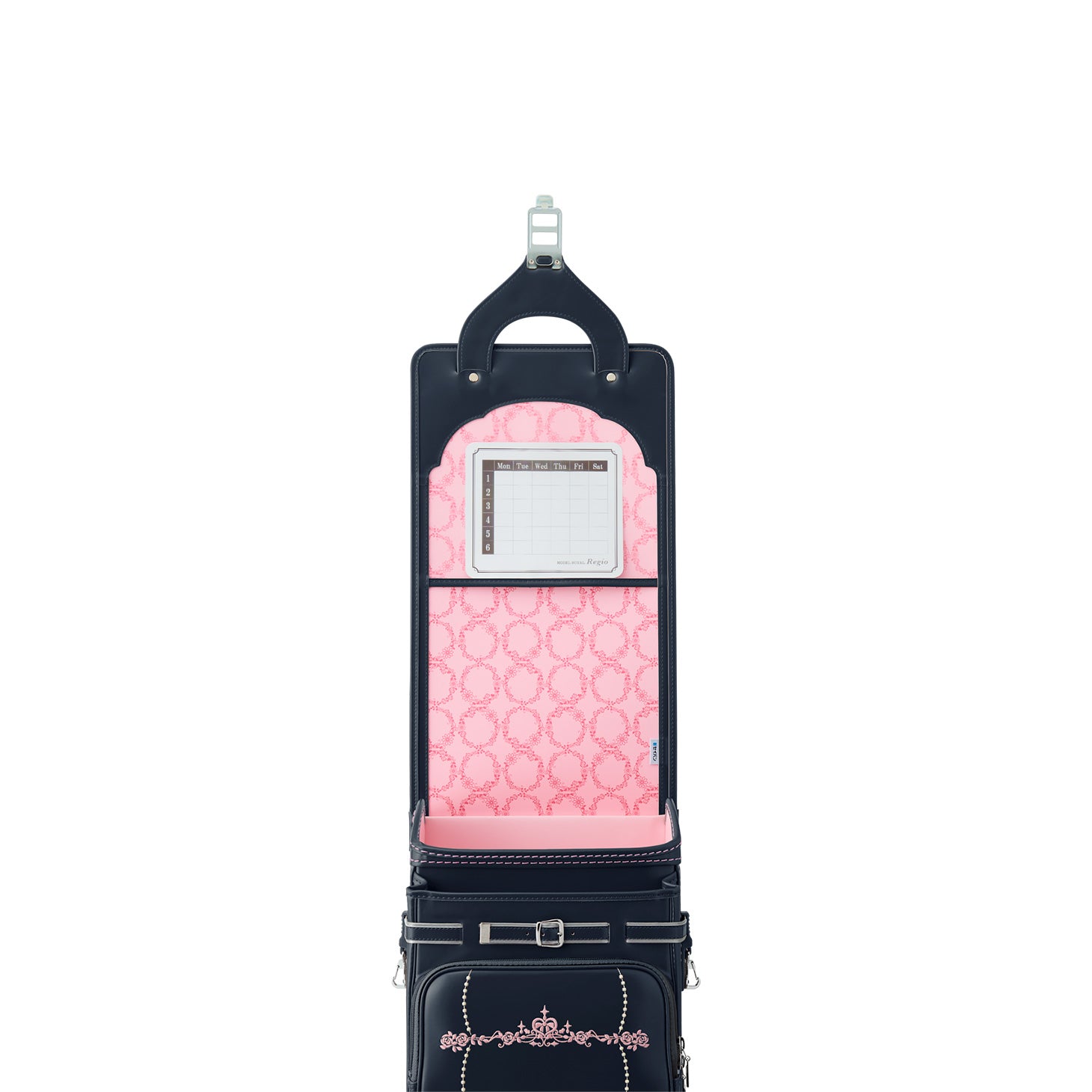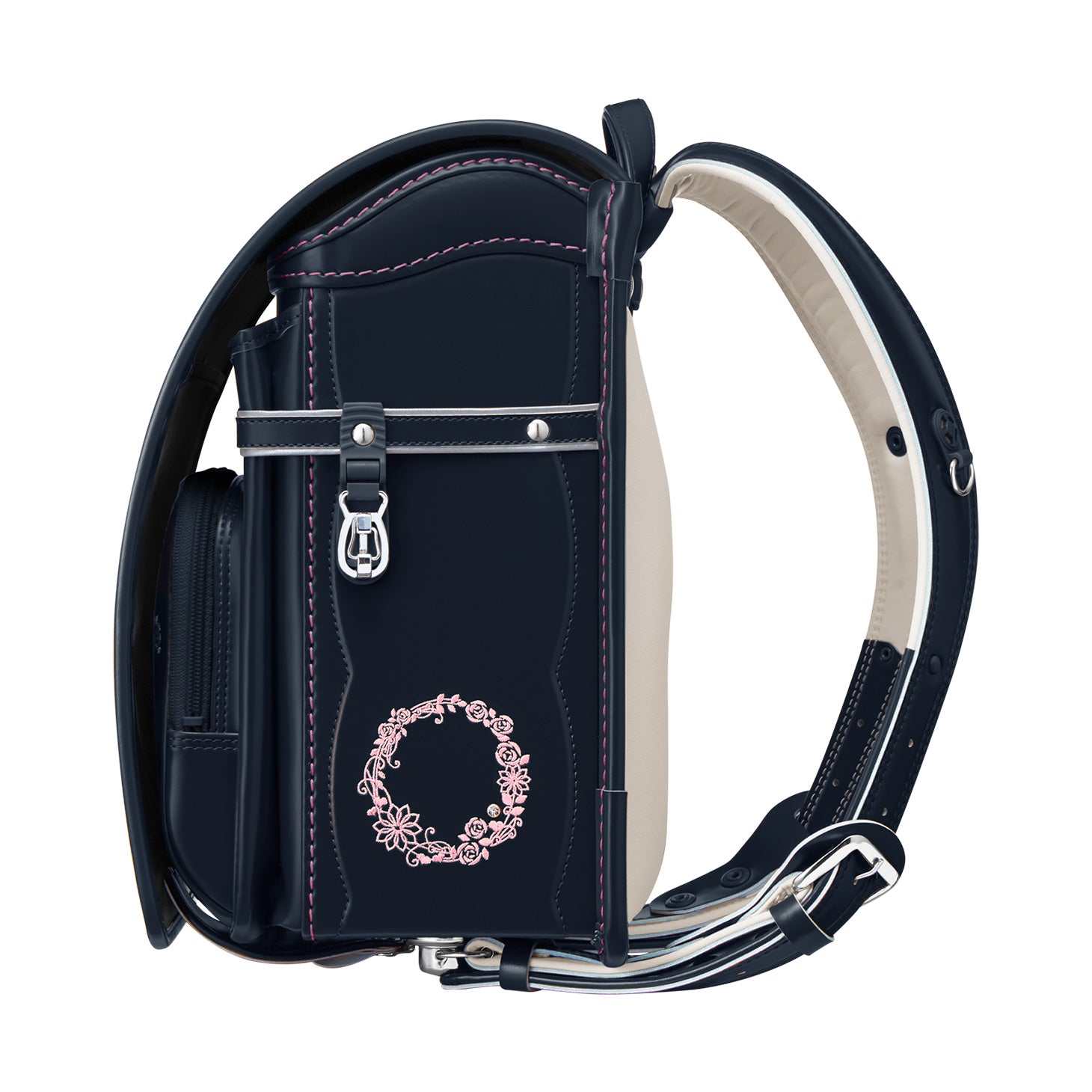 女の子が憧れる「花かんむり」をデザインコンセプトに、高級感を感じさせるデザインに仕上げた「モデルロイヤル・レジオ ベーシック」。金具類や飾り鋲(びょう)は、ニッケルを使いシックな雰囲気を演出。「せみね」と「ブレスレザー®」で快適さを充実させた、高学年になっても使いやすい安心のクオリティです。