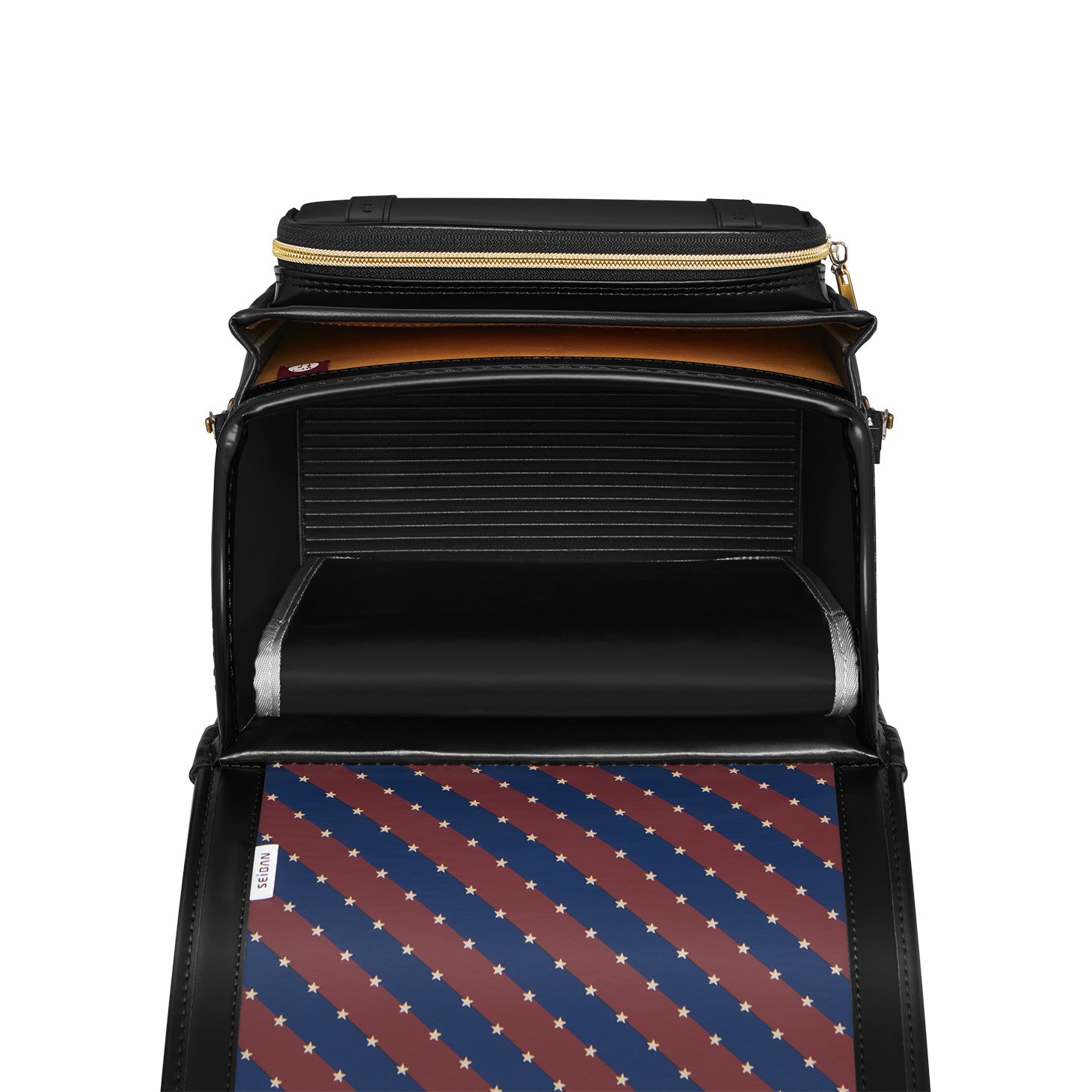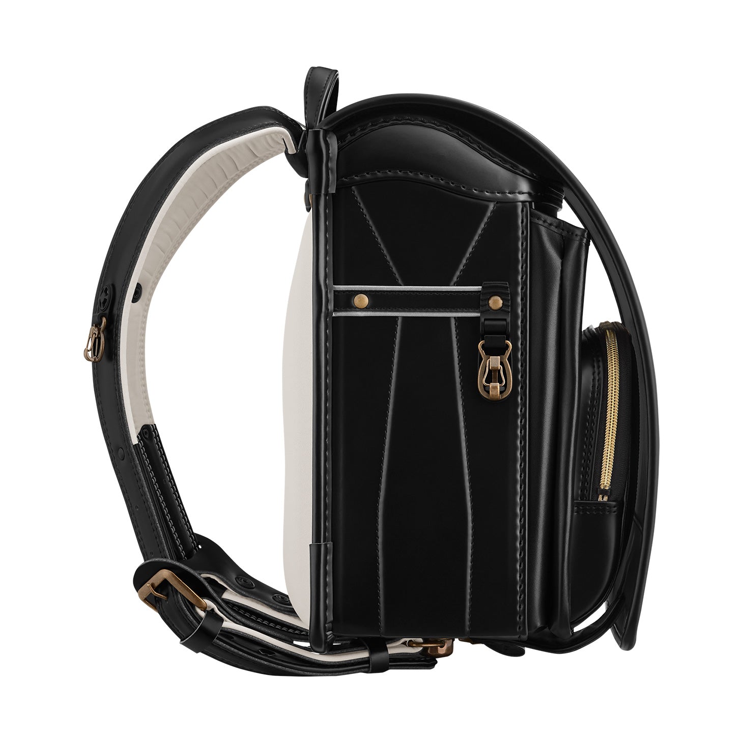 落ち着きのある光沢感が美しいカブセ、ネクタイのシルエットから着想を得たサイドの盛り加工など、フォーマルなファッションアイテムをイメージ。アンティークゴールドに統一された金属パーツがブラックに映え、洗練された大人の雰囲気を漂わせます。