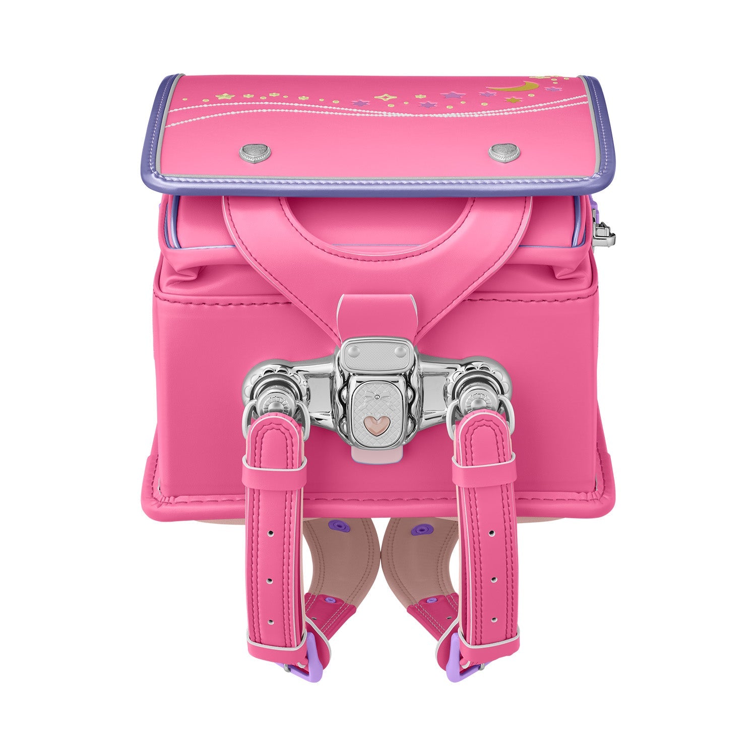 キラキラした魔法の光をイメージしたカブセの刺しゅう、肩ベルトやサイドには星型の反射材を使うなど、ランドセル全体がマジカルな雰囲気に。ライトが当たると反射して光るハート型の飾り鋲(びょう)や、前ポケットにある鍵型のチャームなど、魔法アイテムのようなパーツにも注目です。