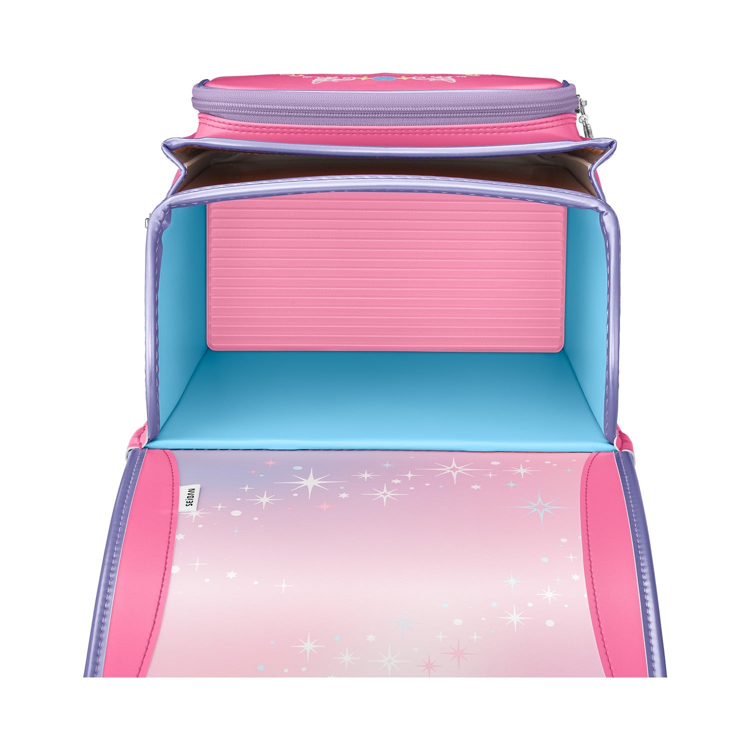 キラキラした魔法の世界をカラフルに表現した「スゴ光 マジカルスカイ」。カブセやサイド、肩ベルトまで広範囲に反射材をデザインし、カラフルなカラーにパール生地を合わせたコンビネーションで華やかに仕上げました。「ラクパッドフレックス」や「ブレスレザー®」など背負いごこちを考えた機能面も充実したランドセルです。
