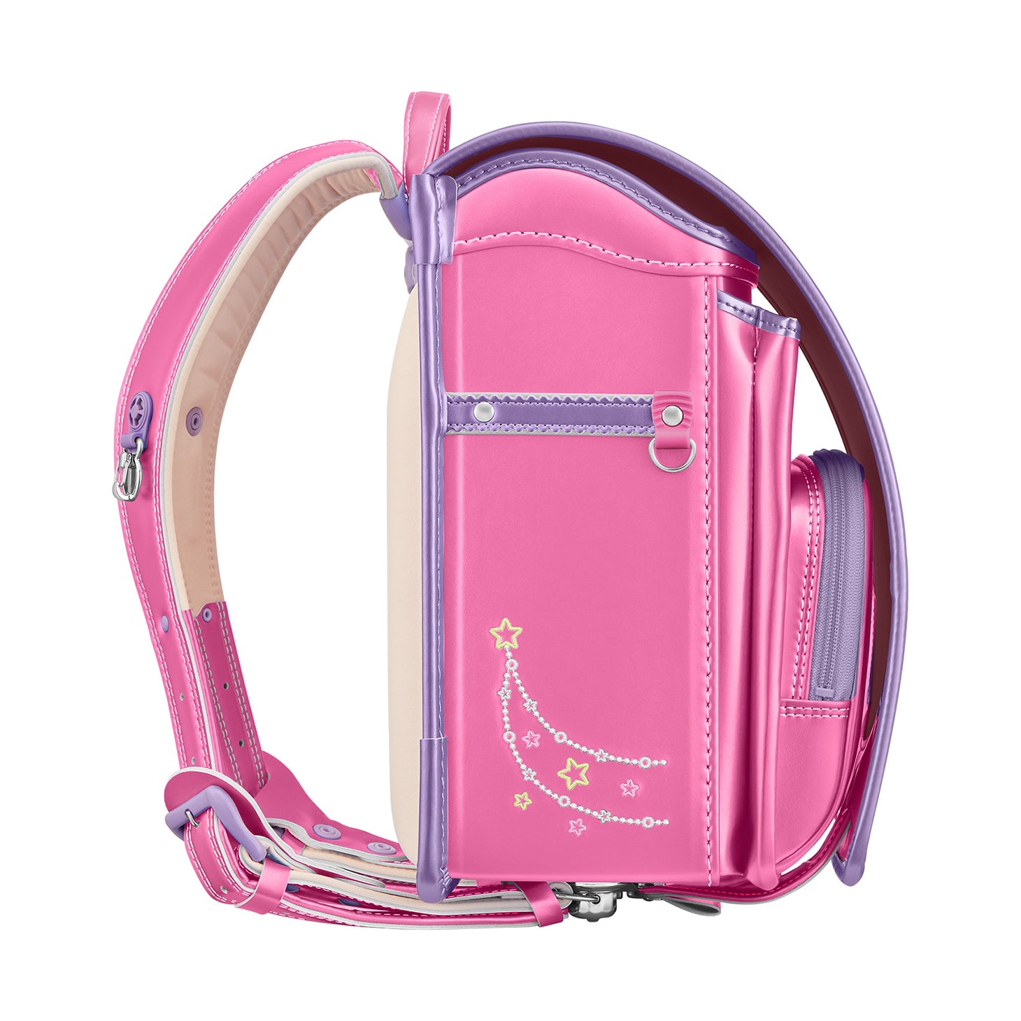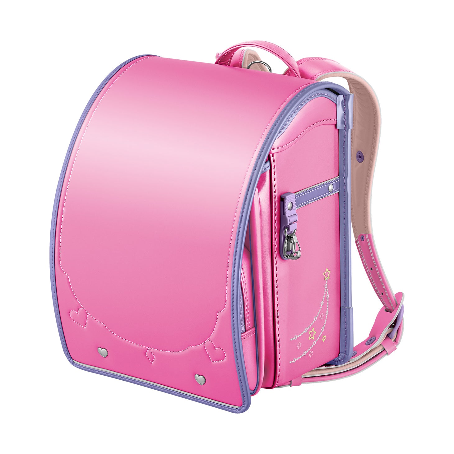 パール生地を使った2トーンカラーがカラフルな「ユアメイト シャイニーポップ」。ビーズアクセサリーをモチーフにした刺しゅうや、ハートモチーフの飾り鋲(びょう)など、大好きなものをいっぱい詰め込んだおもちゃ箱をイメージ。お子さまのからだにフィットする「ひねピタ」や、高い吸放湿性や通気性を誇る「ブレスレザー®」などの機能もしっかり搭載しています。